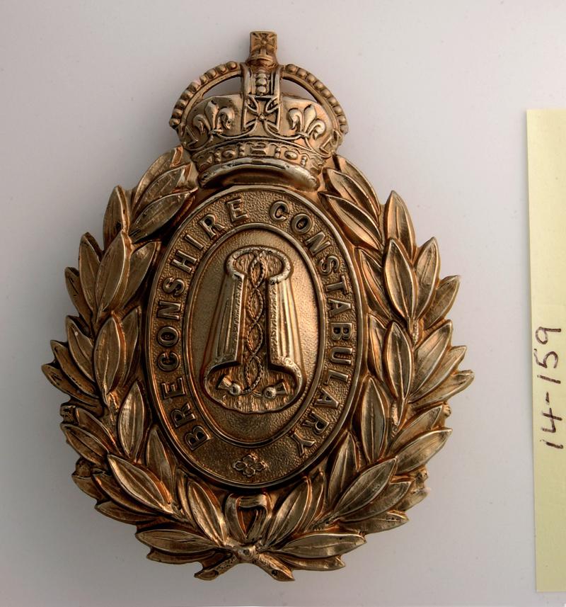 Metal helmet plate. With image of a shield inside a belt, surrounded by a wreath and with a crown on top. The shield has a chevron and is surmounted by a crowned head with wings. The belt is inscribed NEWPORT BOROUGH POLICE. 2 loops at back for attachment
