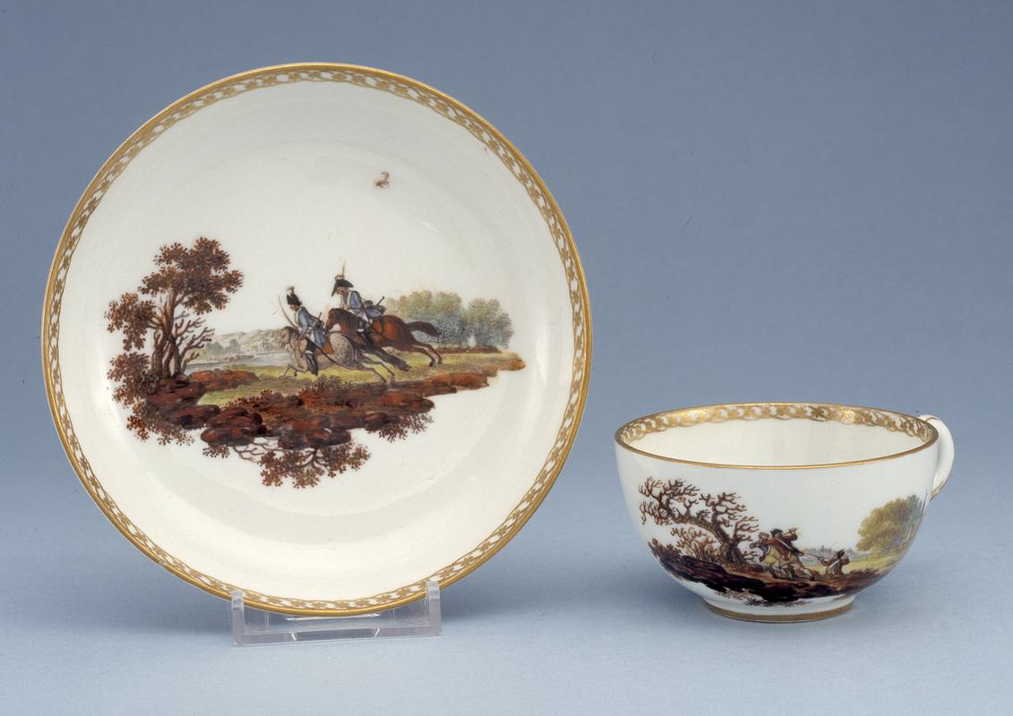 Bowl, slightly greyish hard-paste porcelain, standing on short cylindrical foot-rim, rounded curving sides with flaring lip-rim; crudely painted in polychrome enamels with to one side of the exterior body a coat of arms with three chains, a horn and a cross, and with a crown above, around the rest of the exterior body are scattered insects including a butterfly, a ladybird and a spider, heavy gilt bands around the foot-rim and interior lip-rim.
