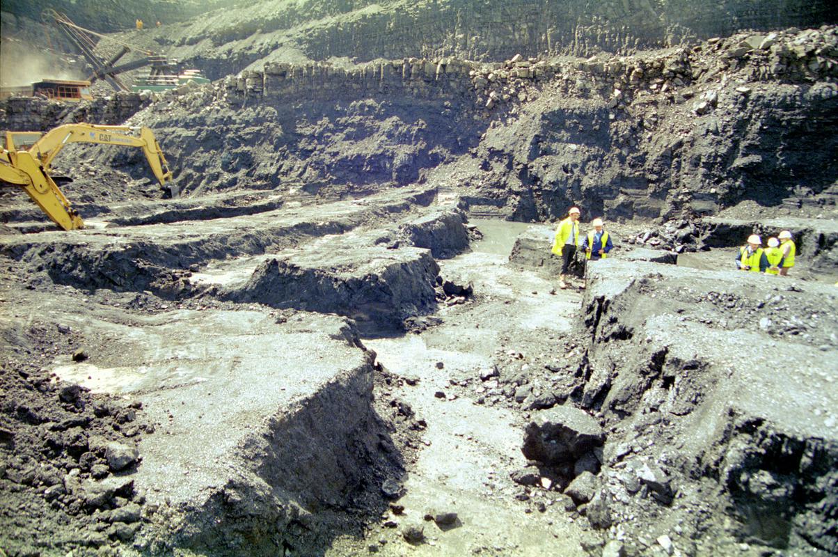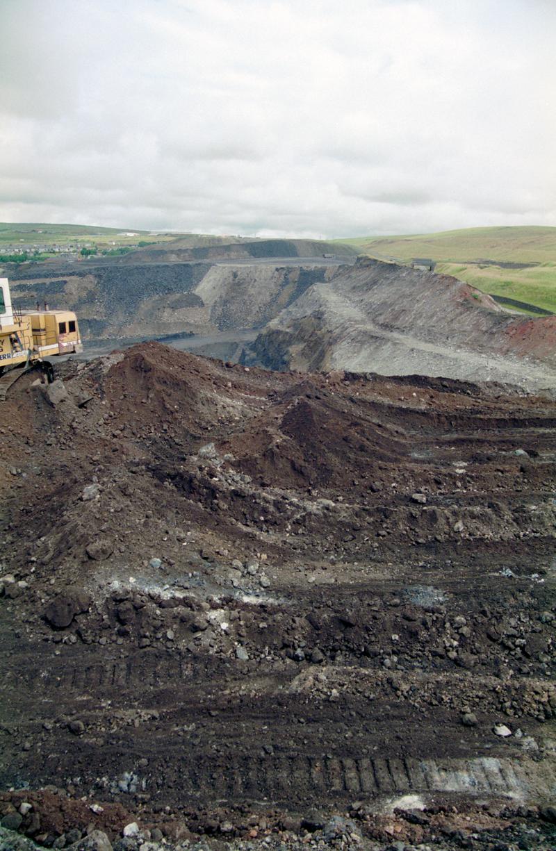 East Merthyr reclaimation scheme, phase 2, looking north. Removal of Great White Tip, showing Opencast coal site at centre and the A4060 road in background. This image forms part of a panorama with 2019.30/1.3-/1.4 and 2019.30/2.1- /2.3.