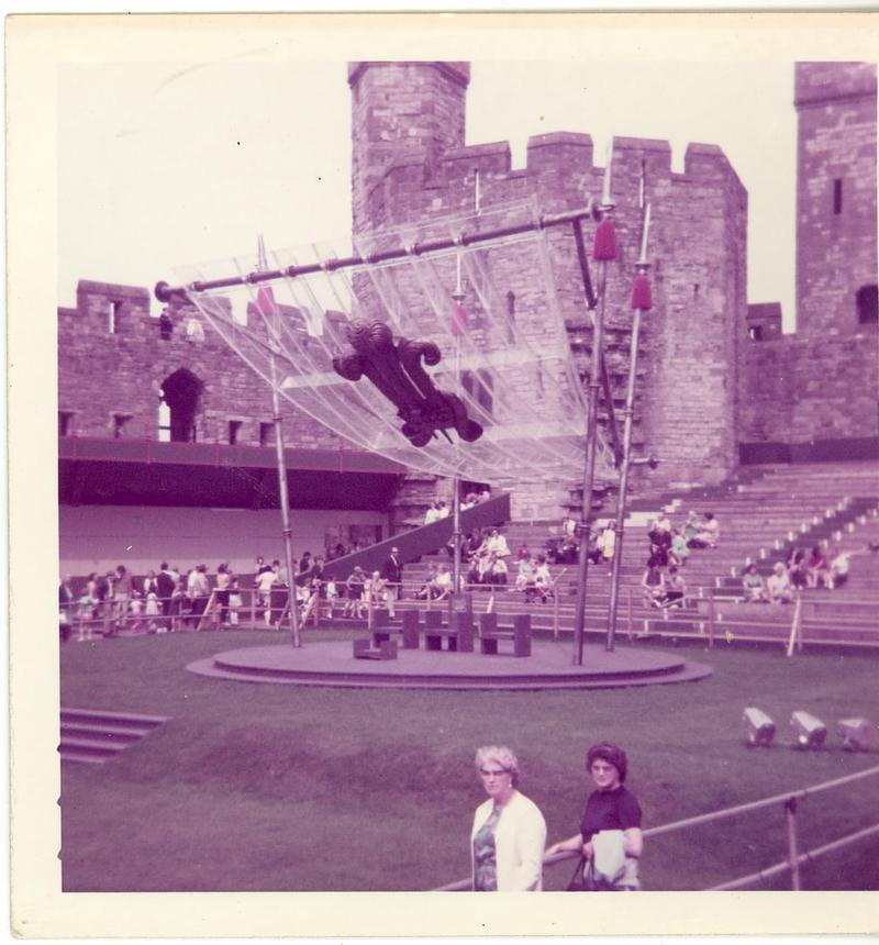 Three members of a Bargain Gang making slates at Penrhyn Quarry. Tools used include the Rhys Mawr (large mallet), manholt (broad bladed chisels), cyllel fawr (large crank-handled knife as used by the man on the left), and trafal (a sloping stool & bench on which is mounted a fixed cutting edge). Measuring stick seen on left hand side, each notch denoting size of slate e.g. Queen, Lady, Duchess etc.