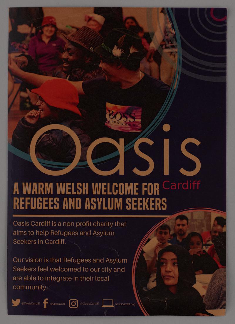 Double-sided flyer produced by The Plate project at Oasis Cardiff – a charity founded in 2008 that aims to help refugees and asylum seekers in Cardiff. The back of the flyer is printed with quotations from an interview with Huda, a refugee from Sudan. The front features a photograph of her, together with The Plate project logo and mission statement: 'INSPIRED FOOD, FROM INSPIRING PEOPLE.'