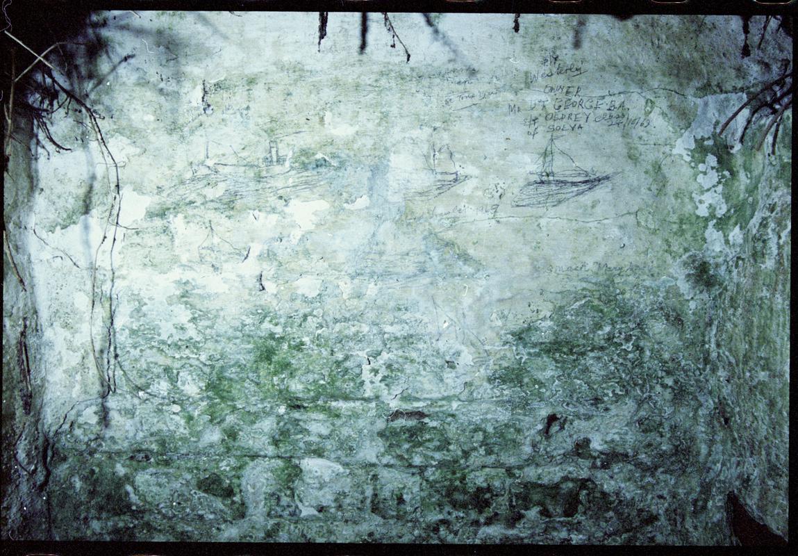 Graffitied tŷ bach in a garden in Trefin, negative