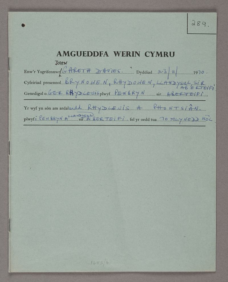 Responses to a 1957 questionnaire created by the Welsh Folk Museum and distributed by Anglesey Rural Community Council. Completed by Harri Williams, Rhos-y-bol, Anglesey on the subject area of 'a typical work day in year's gone by'. Questionnaire, Anglesey Rural Community Council 1957 The questions were prepared by the Welsh Folk Museum in 1957 as a way of collecting and documenting information on the ‘common working day’. The questionnaire was distributed by Anglesey Rural Community Council. The questions have been typed and the responses have been hand-written.