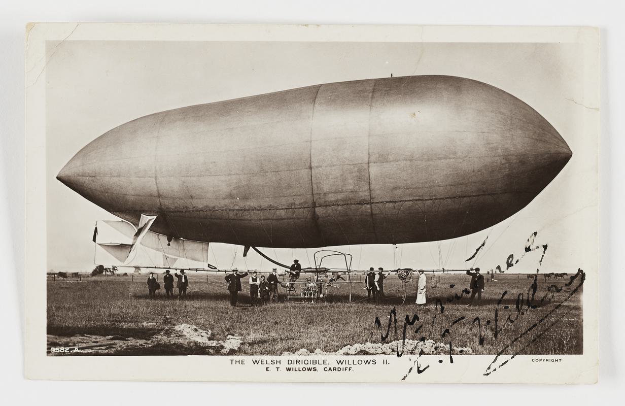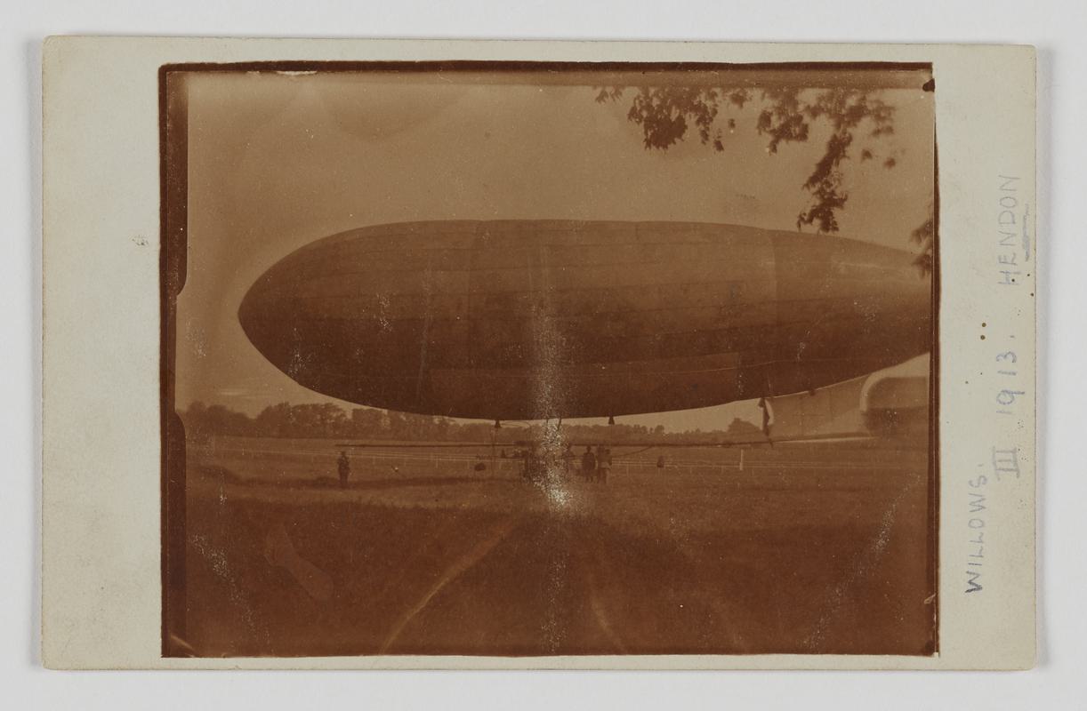 The new Willow's airship on a flight over the hangers at Hendon, North London. Known as the Willows 5, it emerged in November 1913 and could carry 4 people - Taken from a postcard date-stamped 8th July 1914.