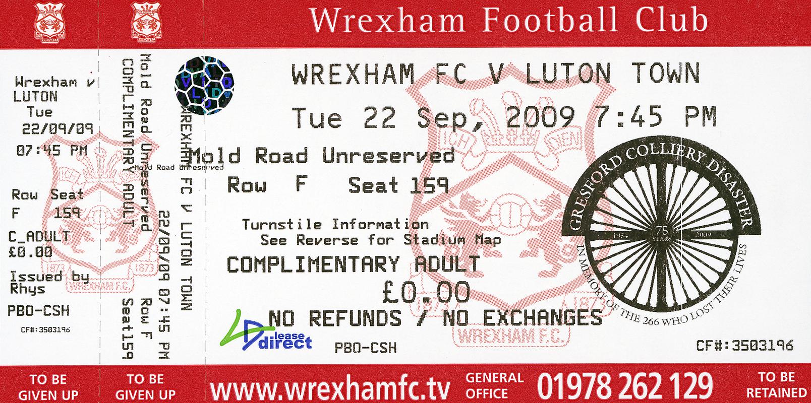 Blue Wrexham Football Club with memorial badge on upper shoulder to commemorate the Gresford Colliery disaster in 1934. A memorial match against Luton Town was held on the 22 September 2009.