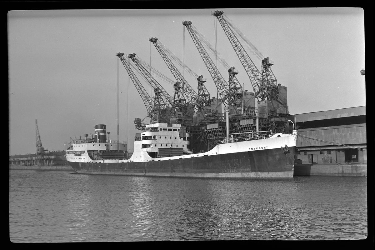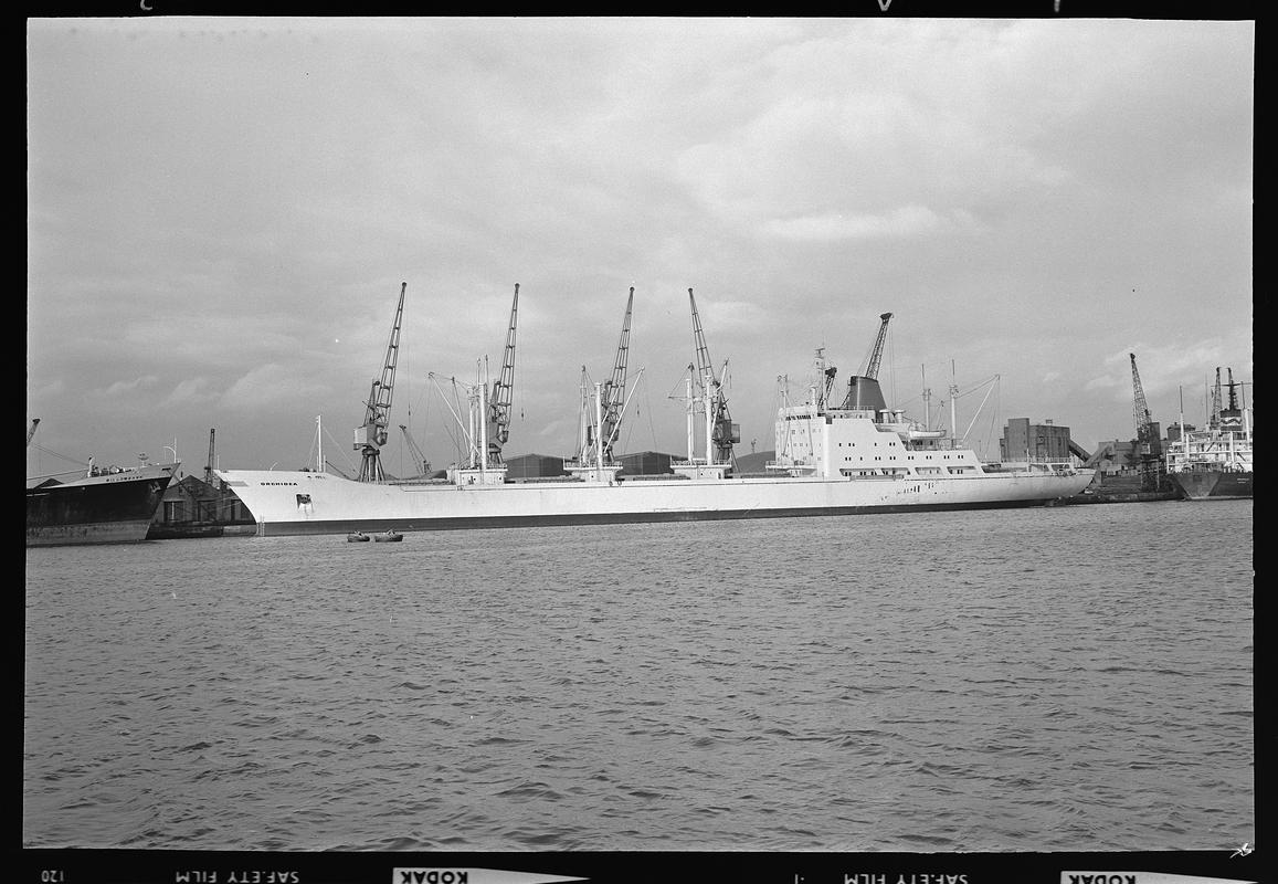 Starboard stern view of R.Y. BRITANNIA at Cardiff Docks. Tug : LOWGARTH also in image.