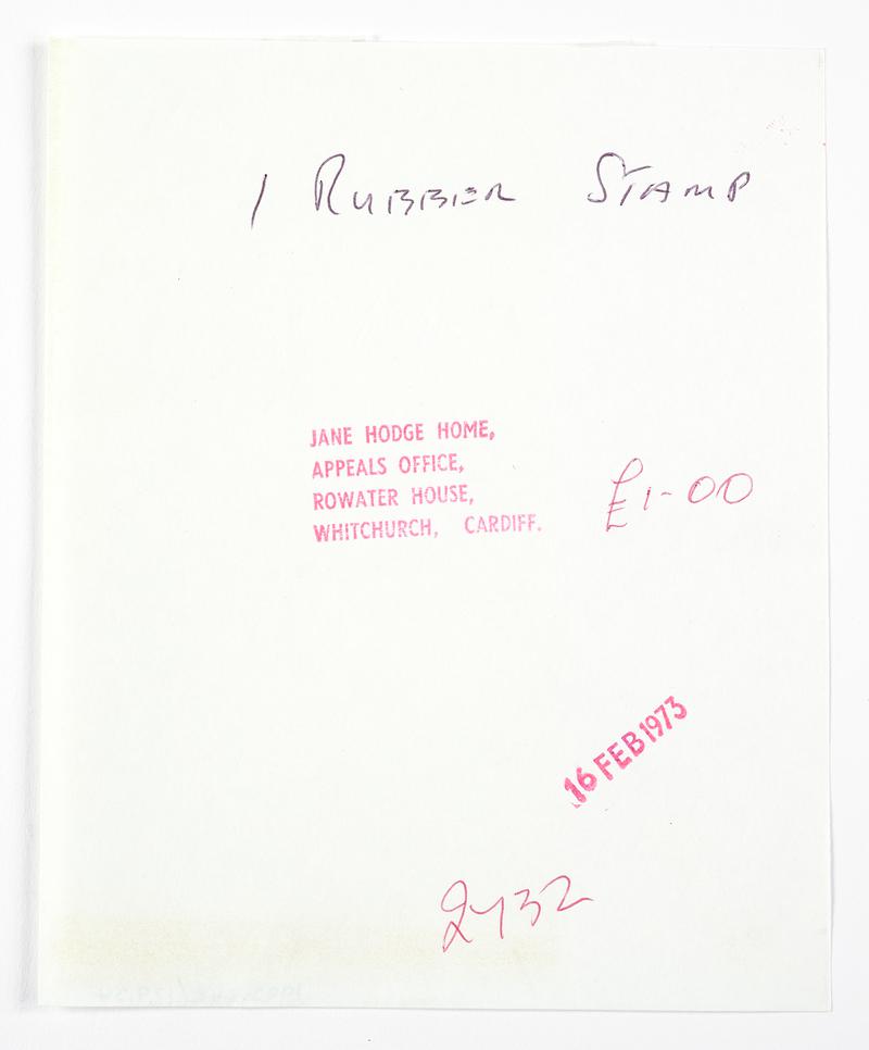 Ink stamp impression for 'Wah Kiu Chinese Take-Away', Gelli, Rhondda. Handwritten order details on the front. Stamped with date 26 October 1979.