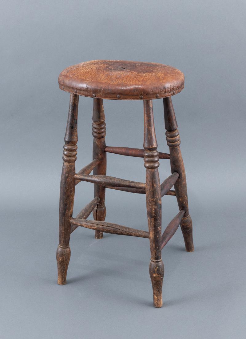 Armchair, Windsor type; reinforced back and 8 spindles; 2 curved spindles supporting the arms; H stretcher connecting turned front legs and plain back legs; ash frame, elm seat.