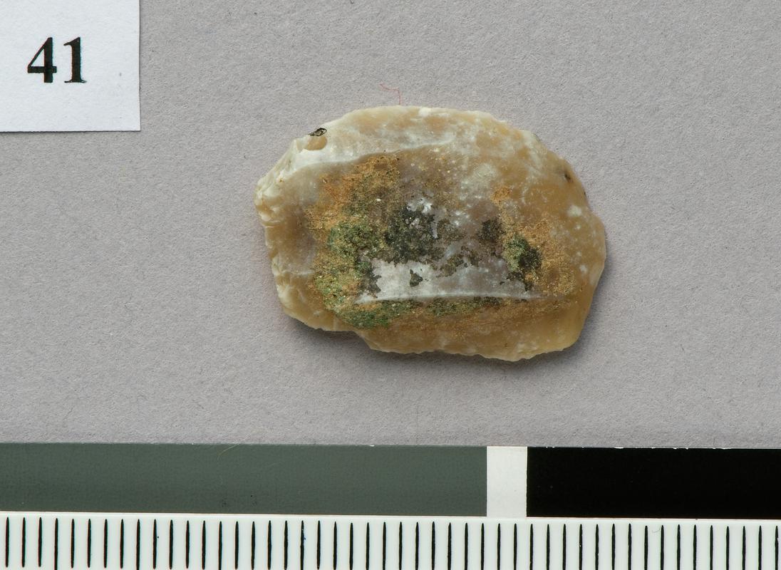 A large flint blade of grey unpatinated flint. There is some irregular chipping along one length which indicates that the blade has been used at some time.