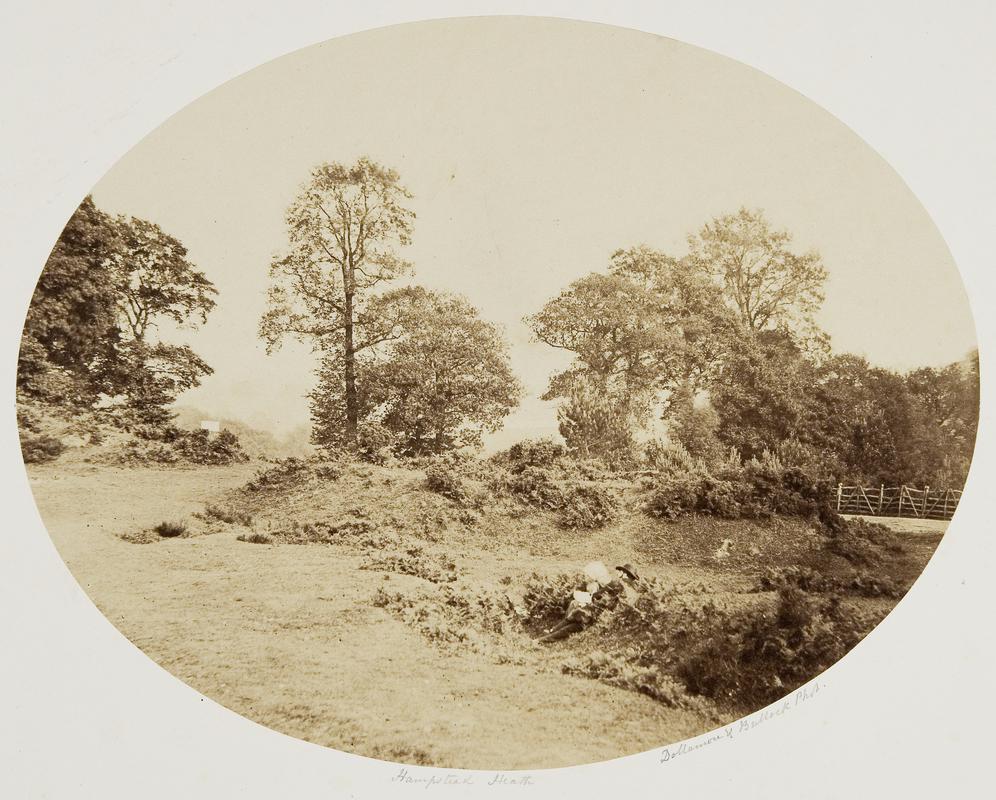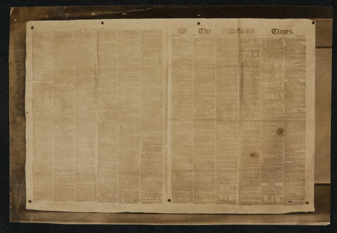 Catalogue of 1854 exhibition by Photographic Society, 'Exhibition of Photographs and Daguerreotypes at the Gallery of the Society of British Artists'. Published by Society for first exhibition held at the Gallery of the Society of British Artists, Suffolk Street, Pall Mal, London, at a cost of 6d (pence) entrance fee one shilling. Inside cover has three newspaper cuttings on the exhibition by the newly formed society and inside back cover has cutting from The Morning Post reporting on the opening of the exhibition.