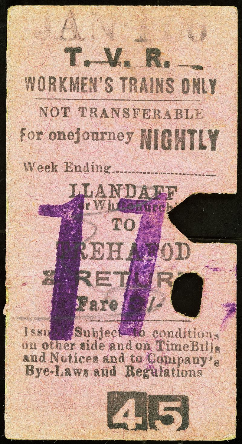 Blue/green card with black print. T.V.R. ticket, Llanbythery to St. Hilary Road, fare 3d.