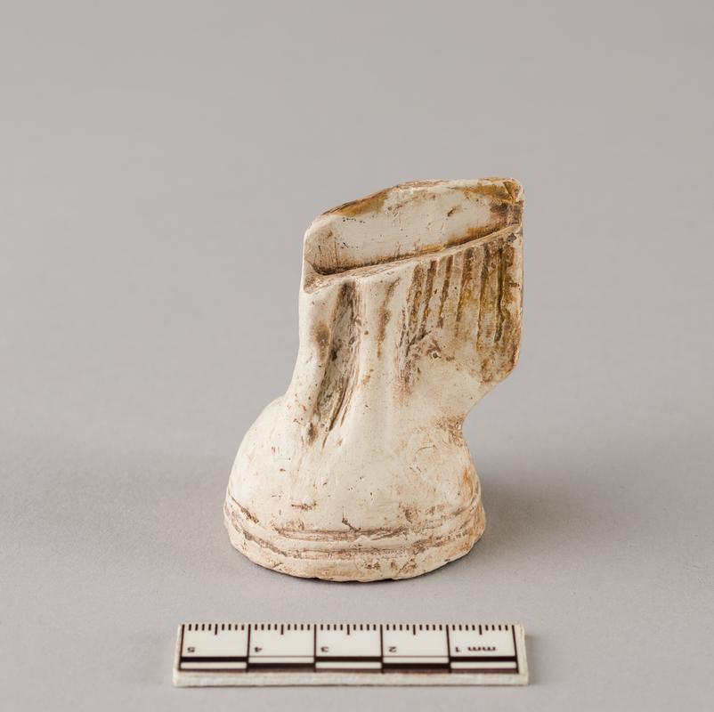 Upper part of the figure of a child, comprising head, shoulder and left upper arm. Veiled over the head by a garment extending from the right side of the figure. Probably from a Venus figurine showing the goddess protecting one or more infants.