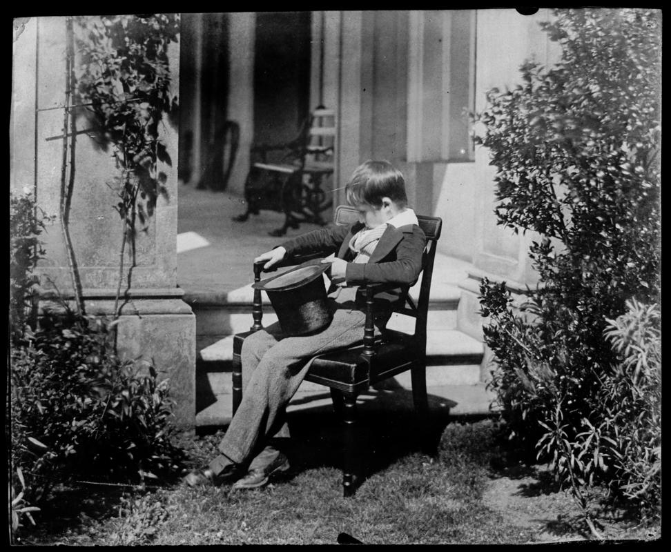 Unwaxed calotype negative of Emma Llewelyn seated in a chair, with an umbrella, next to the porch at Penllergare.