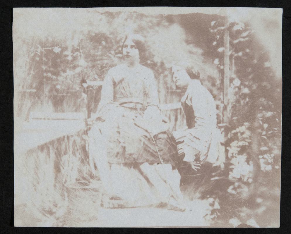Salted paper print. Emma and Thereza Llewelyn on the rocks. Photograph has pin holes in all corners apart from the top left.