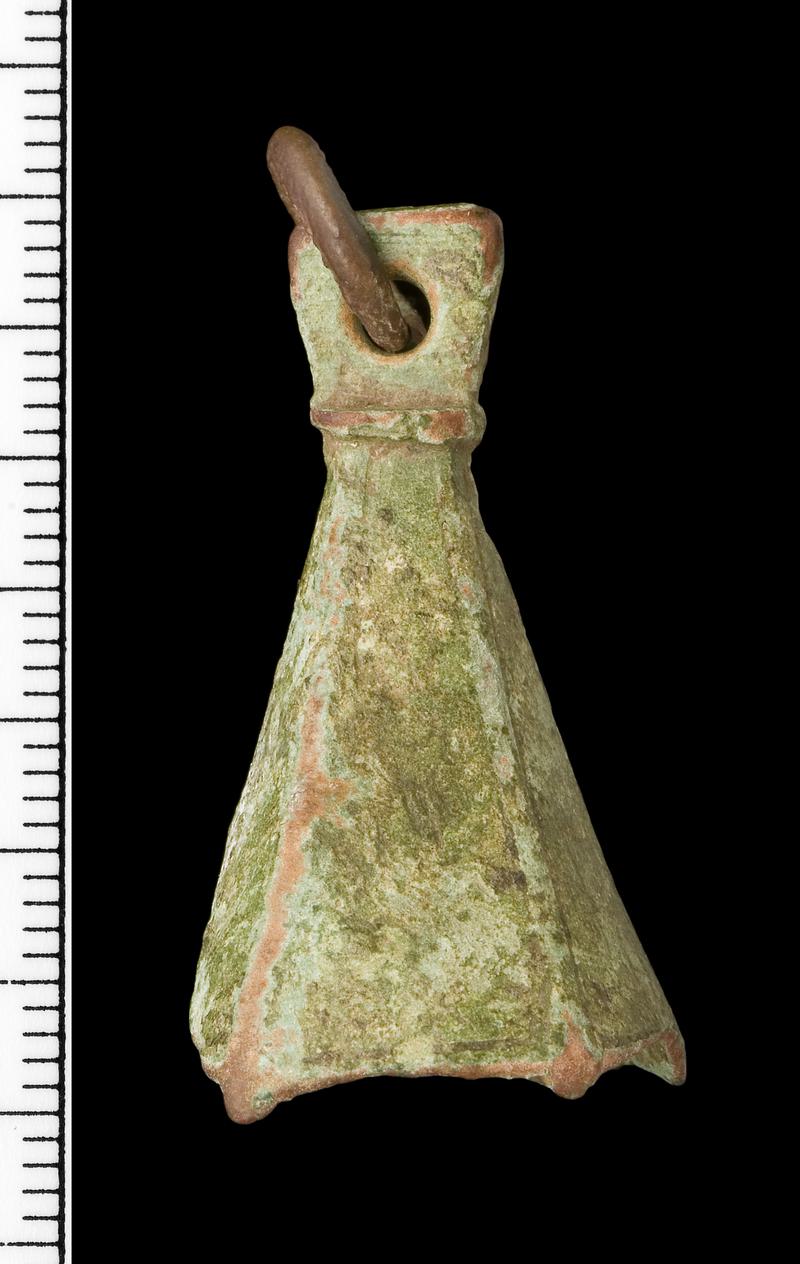Copper alloy penannular brooch terminal of flattened expanded form. A circular collet at the junction of the hoop and terminal once held a glass or amber stud now missing. The terminal is recessed externally and is perforated by three small holes probably a means of attachment for a now missing decorative metal inlay (gold or silver). There are two larger holes at the extremities of the fragment which may be secondary.
