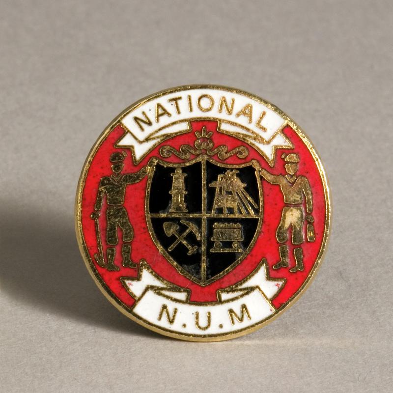 Whitwell Colliery N.U.M. strike badge. Whitwell N.U.M 1984/85 DISPUTE is inscribed on the front of the badge along with symbols of clasped hands, a miners' lamp and the word LOYALIS. Pin clasp on the back of the badge.