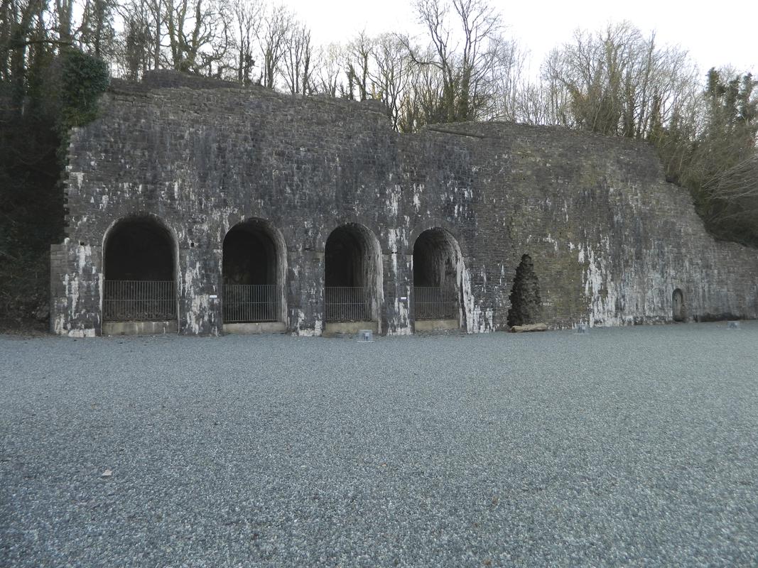 Kilgetty Ironworks, Stepaside. Left hand half of panorama (joins with 28) of ruinous front elevation of block of beehive coke ovens, viewed from east.