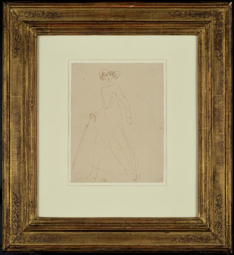 In 1874 this painting was included in the first Impressionist exhibition. The sitter was Madame Henriette Henriot, who acted at the Odéon in 1863-68. Renoir often used her as a model. By giving the painting the title 'La Parisienne', he indicated that it represents a type, rather than a particular individual. A reviewer of the 1874 exhibition wrote 'The toe of her ankle boot is almost invisible, and peeps out like a little black mouse. Her hat is tilted over one ear and is daringly coquettish...The smile is false, and the face is a strange mixture of the old and the childish. But there is still something naive about her. One gets the impression that this little lady is trying hard to look chaste. The dress, which is extremely well painted, is a heavenly blue.' Formerly in the distinguished collection of Henri Rouart, a friend of Degas, where it was admired by such artists as Paul Signac, this work was purchased by Gwendoline Davies in 1913.