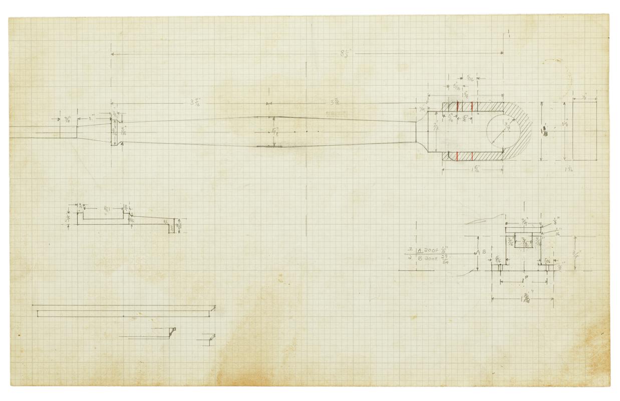 Original technical drawings by Mr Cole for the construction of the side lever paddle engine model (80.78I). Pencil on lined graph paper.