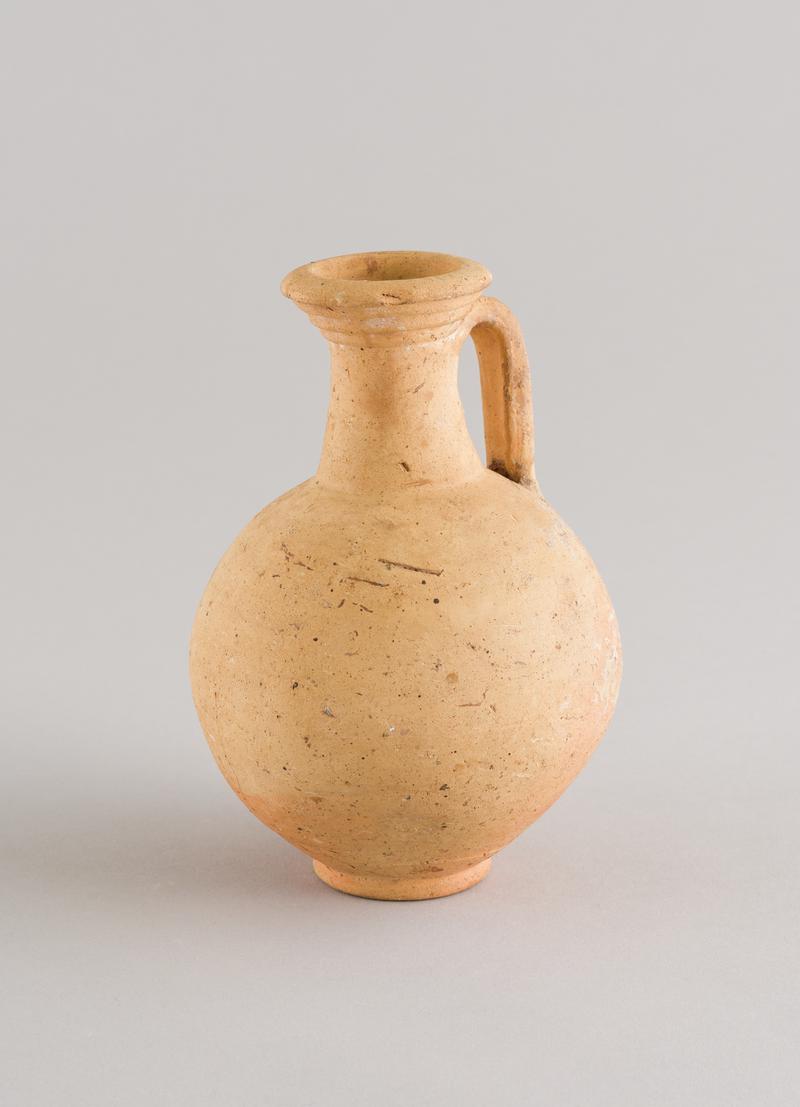 Five-ringed mouthpiece type. The ware of these is uniformly of good quality, dark red with white slip. Three-ribbed handle.