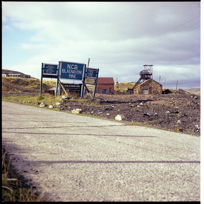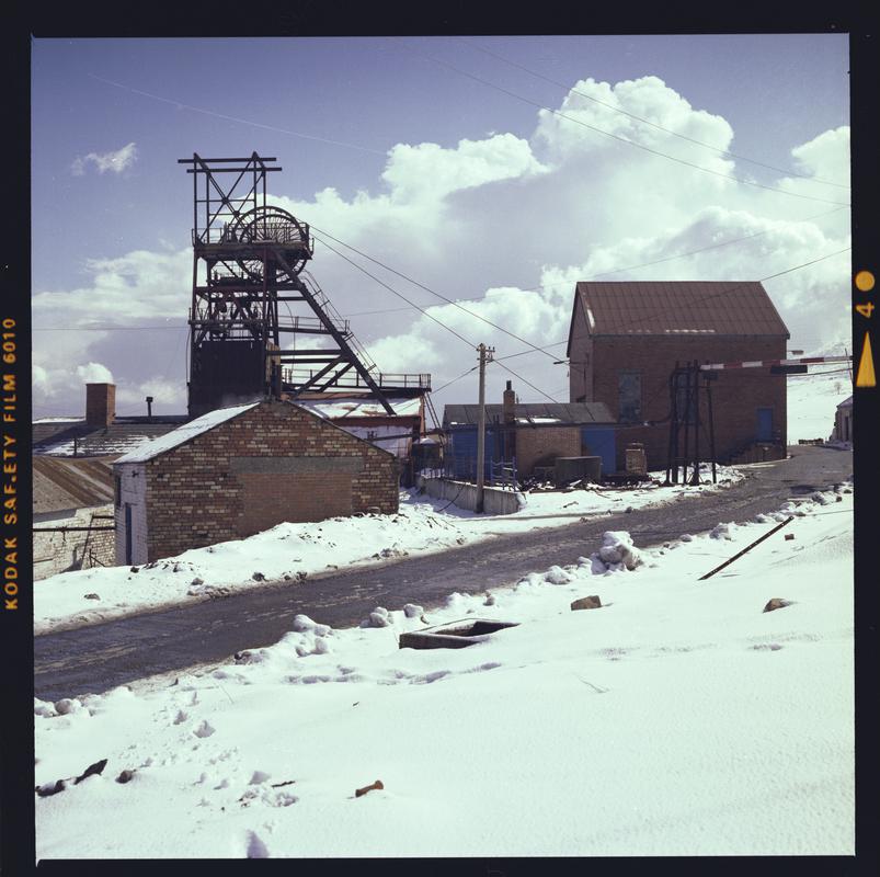 Black and white film negative showing a surface view of Abernant Colliery, 1980. 'Abernant' is transcribed from original negative bag.