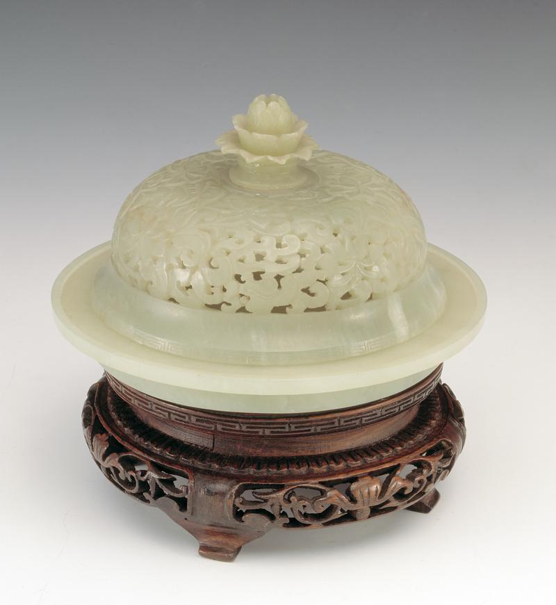 Circular pot, white jade, undecorated except for a line on the lid and a footing on the lower half, with wooden stand.