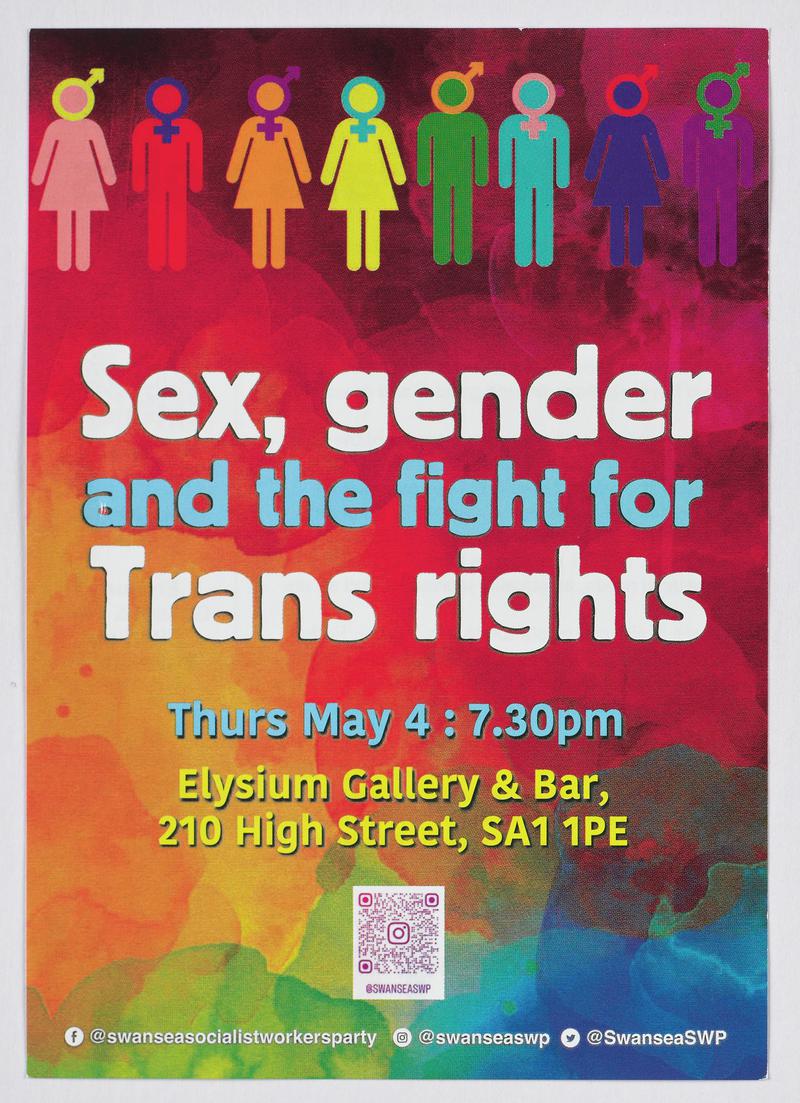 Leaflet 'Sex, gender and the fight for Trans rights', 4 May 2023 at Elysium Gallery & Bar, High Street, Swansea. Given out at Swansea Pride, Saturday 29 April 2023. Collected to show the range of free promotional and advocacy material available at Pride events.