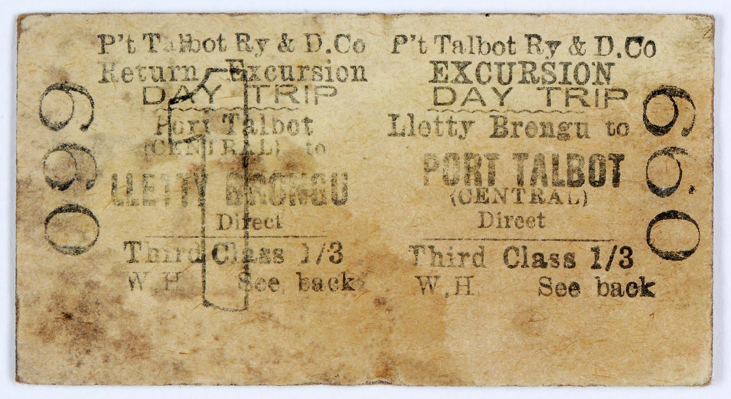 Black print on blue paper with perforation down centre. Return excursion day trip Maesteg to Port Talbot (central), third class. Ticket no. '498'.