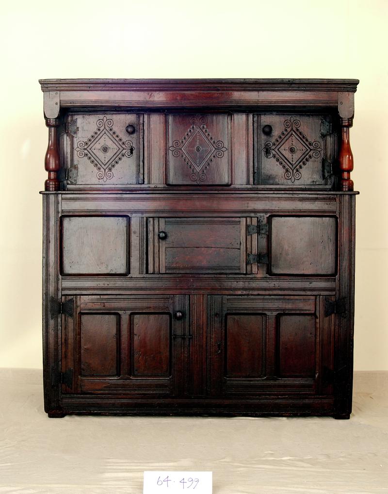 large open-backed wooden cupboard in two sections; the lower section is shelved with 2 cast iron grille shelves and has 2 of its original wooden sliding doors; the smaller upper section has one of its original 4 sliding doors in place and is enclosed at back; the whole piece is lined with tinplate and stands on four castors with two large cast iron handles to each side so that it can be easily wheeled in front of fire