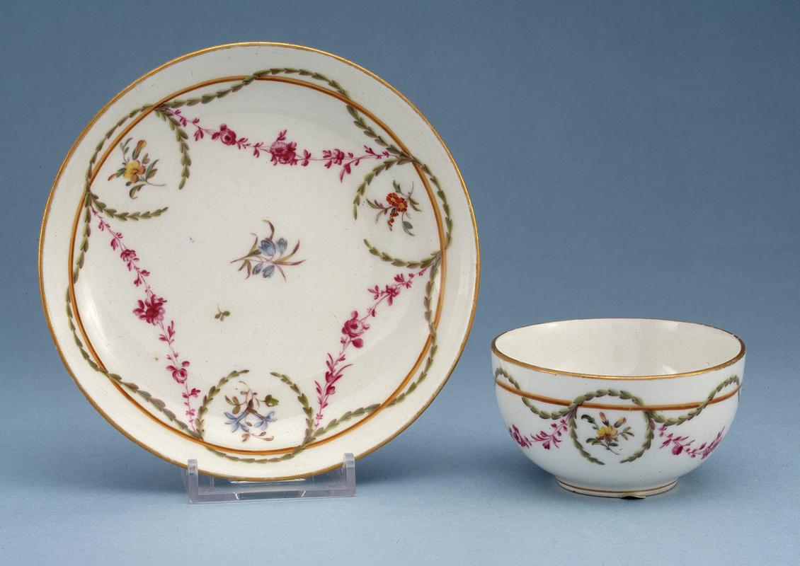 Slop bowl, foot ring with cushion ring above, rim slightly lobed. Decorated in a light underglaze blue with a continuous transfer pattern forming a deep border of variously patterned diamonds, edged with pendant trefoils alternating with pendant diamonds.