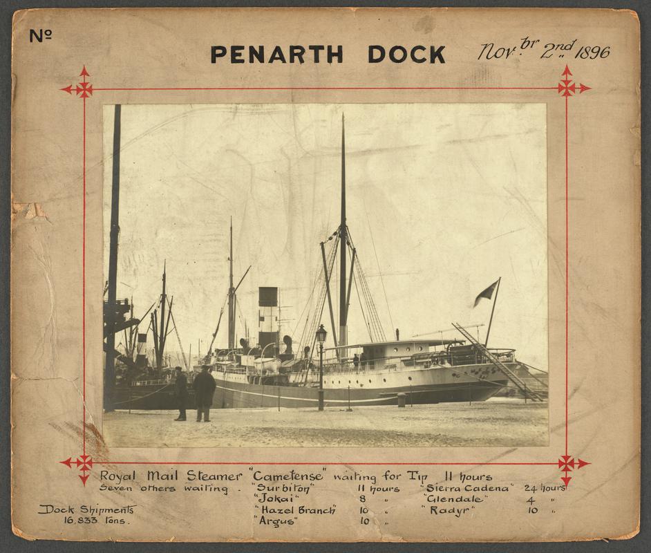 Exterior of T Warehouse, South Wales Warehouses, Victoria Wharf, River Ely, Cardiff, after fire. Mounted on card with red border, with photographers details printed at bottom left.