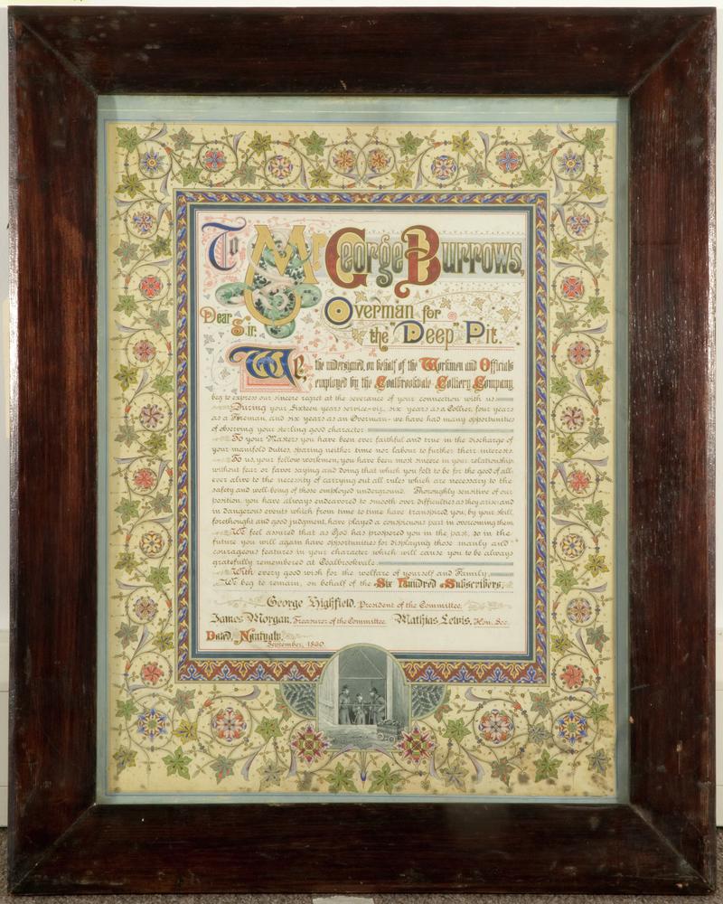 Illuminated address presented to William Davies, Coedcae Colliery, Porth, in appreciation of his role in the Tynewydd Inundation Rescue, 1877.