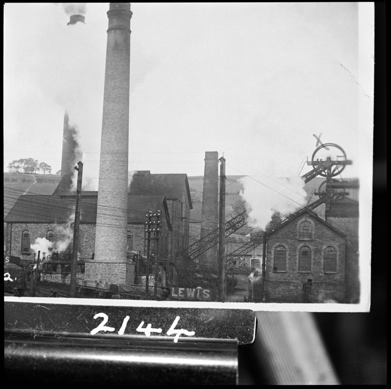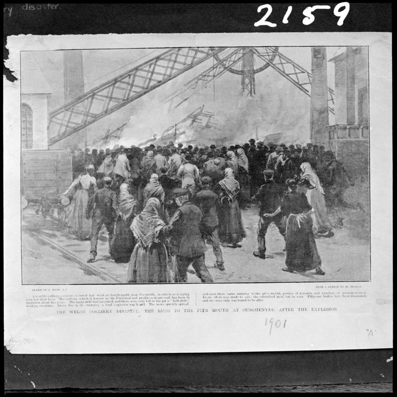 Surface view of Universal Colliery, Senghenydd, photographed from a publication. Caption reads 'The Senghenydd Pits (York and Lancaster). Scene of the Terrible Colliery Disaster, Tuesday, October 14th, 1913. Previous Disaster at the same Pit, May 24th 1901'. 'Senghenydd 2nd disaster' is transcribed from original negative bag.