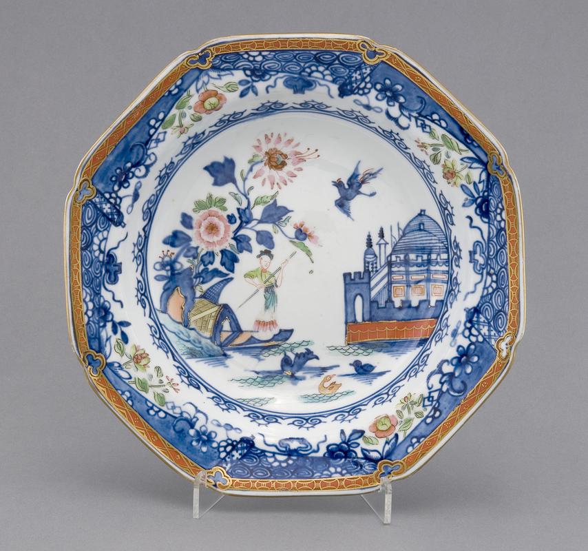 Dish, soft-paste porcelain, oval form with short foot-rim, curving sides and a scalloped edge to the rim; the upperside of the dish profusely decorated with richly painted flowers, including a large rose and a tulip, a chocolate edge to the rim.