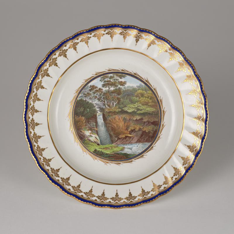 Cream tureen, soft-paste porcelain, greenish paste with creamy brown translucency, wide spreading foot ring, oval body shaped into four lobes and with rounded sides, two short scroll handles; each side painted with an oval titled view in polychrome: 'Hafod', featuring Dologau bridge over the River Ystwyth running between wooded hills, and 'Hafod', featuring the River Ystwyth looking south from the site of the old Alpine Bridge towards Hafod Gardens, both framed with a blue line edged with gold and gilded sprays, the rim with gilded pendant leaves below a blue border with gilded dentil edge, gilded bands round the waist and foot, gilding on the handles.