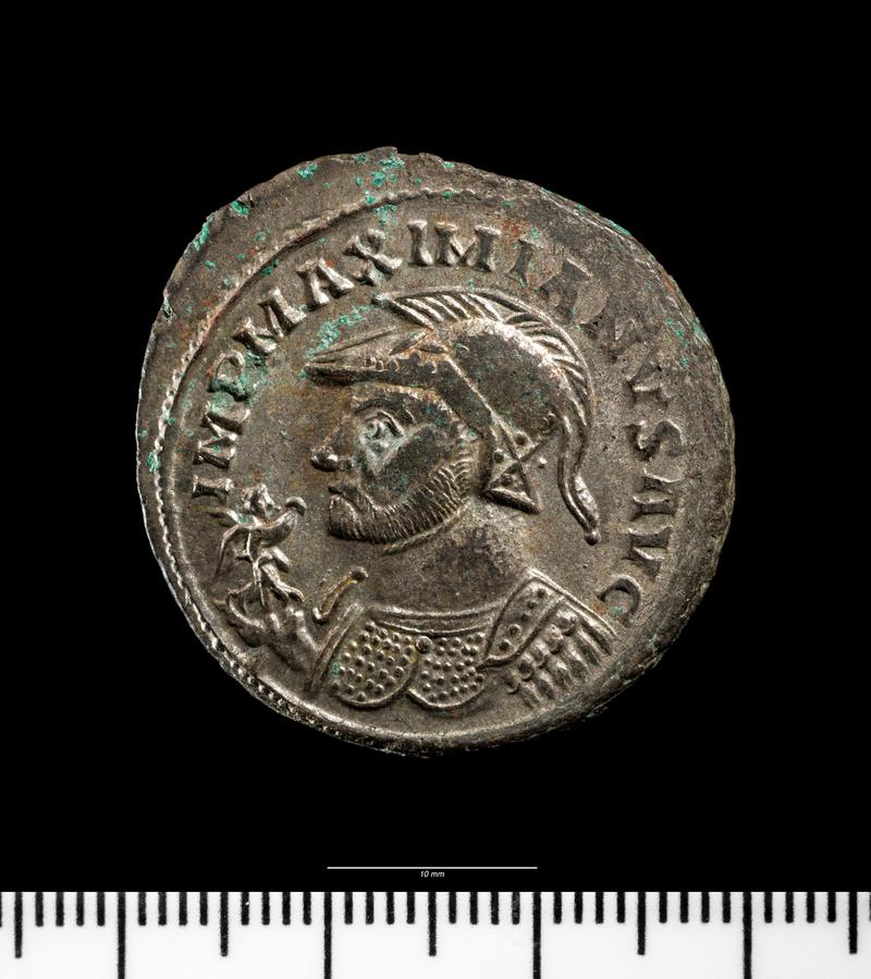 Notes: In September 1957, Mr Leonard Borlase, a ploughman, reported the discovery of several Constantinian bronze coins in a field west of Pantycoed, Llanberthery, near Barry. Subsequent investigations with a mine detector revealed the mass of the hoard still in place, contained in the lower part of a grey pottery vessel. Although some coins ended up in private hands, the bulk of the hoard, some 811 coins, were recovered, and are now held by the NMGW.