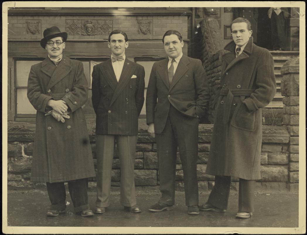 Photograph of internees on the Isle of Man, about 1940-41. Left to right: Vic Gambarini (Porth), Luigi Rabaiotti (Port Talbot), Domenico Gambarini (Porth), and Aldo Servini (Aberdare).