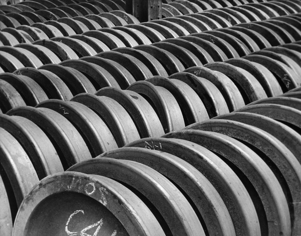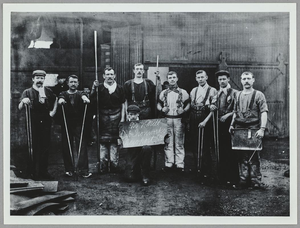 Original master for panel 'Sirhowy Ironworks c1877'. Panel split consists of typed English main description at left, print of pen and ink drawing of Sirhowy ironworks c.1877 signed by artist and dated '00', missing section below that, print of pen and ink drawing showing cross section of a blast furnace, print of pen and ink drawing of pneumatic lift with a bilingual description below, 2 prints of pen and ink drawings showing 'Plateway' and 'Edge Rail' with typed bilingual description, and typed Welsh main text.