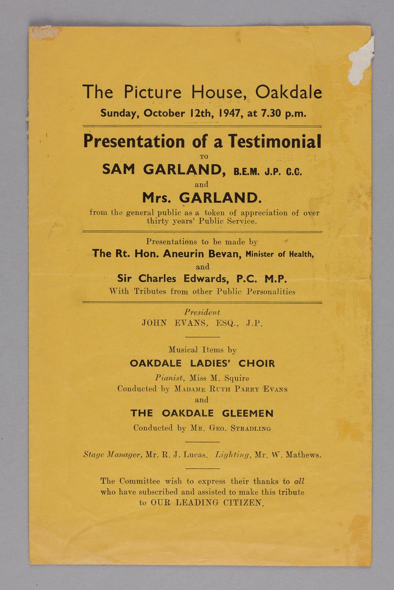 Cast iron plaque formerly affixed to the wall of the New Hall - a cinema attached to Oakdale Workmens' Institute (see item no. F96.1) Text reads ASSISTED FROM THE MINERS' WELFARE FUND. The cinema opened on 2 November 1927 following a grant of £2,500 from the Welfare Fund.