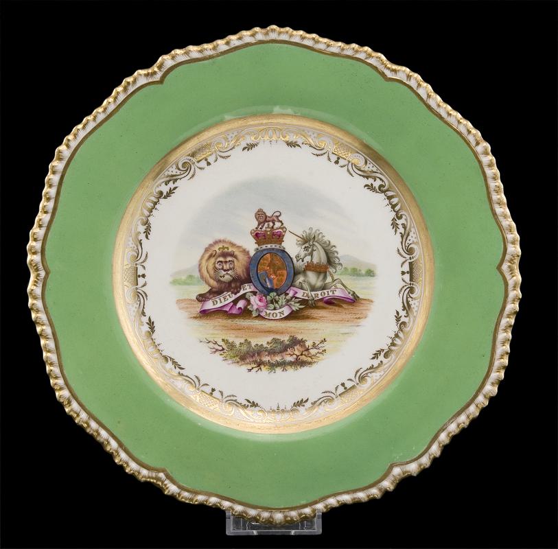 Dessert plate, standing on a shallow foot rim, crucifrom moulding, rim moulded in four small and four large lobes; the centre painted with a spray of two pink and white briar roses, and the border with a continous arrangement of wild flowers, including wild stawberries, speedwell, red campion, michaelmas daisies, bluebells and buttercups. From the Dynevor service.