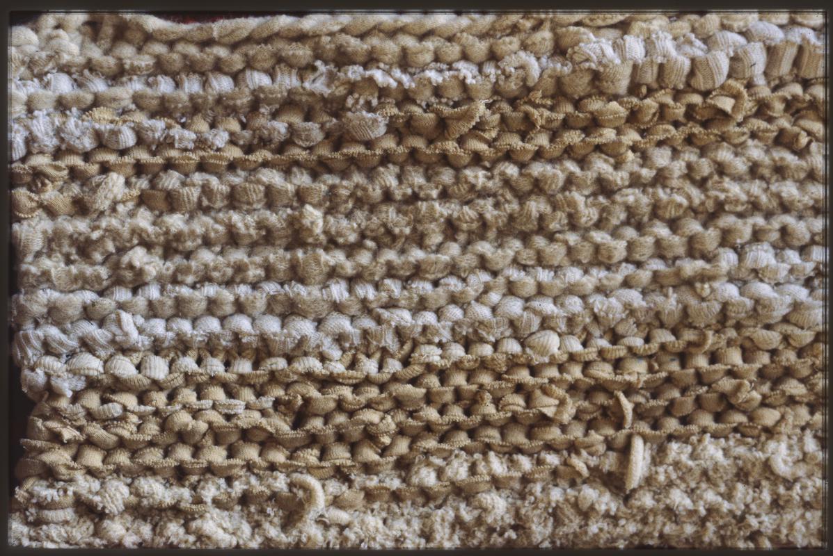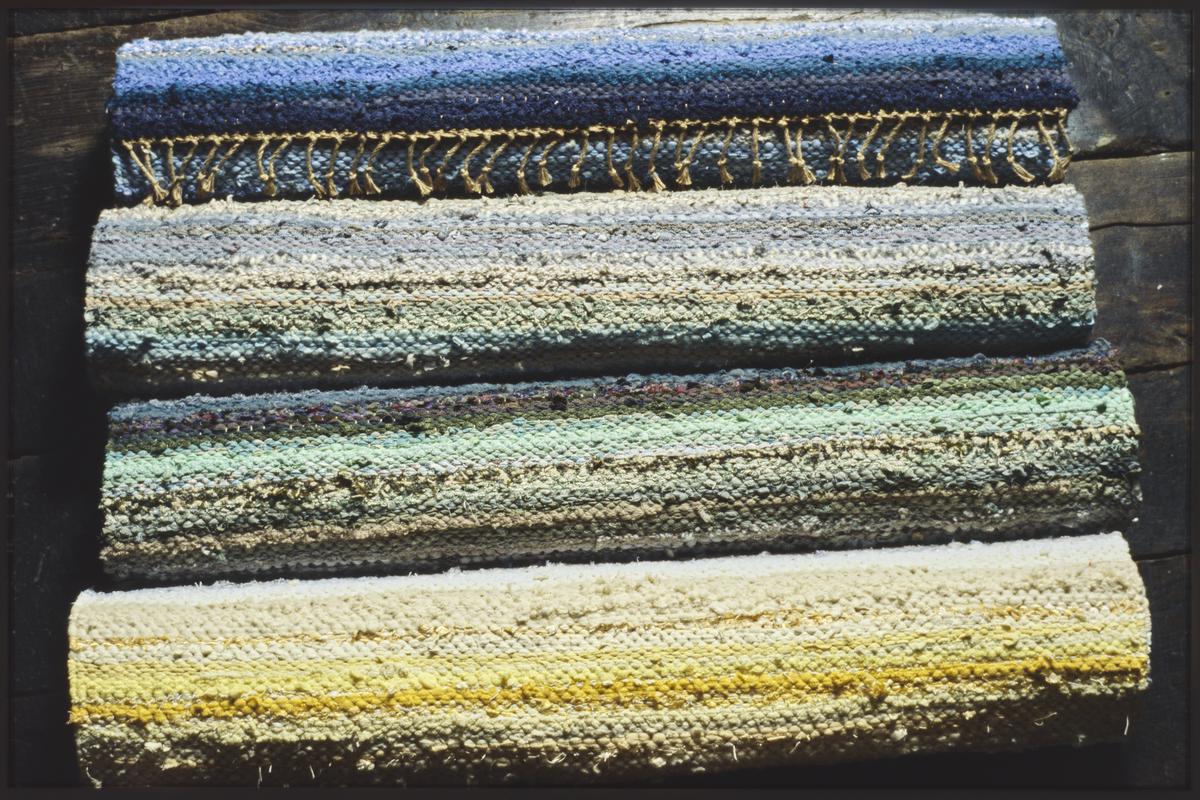 A swatch of six samples of woven wool with label 'Warp no 101'.
