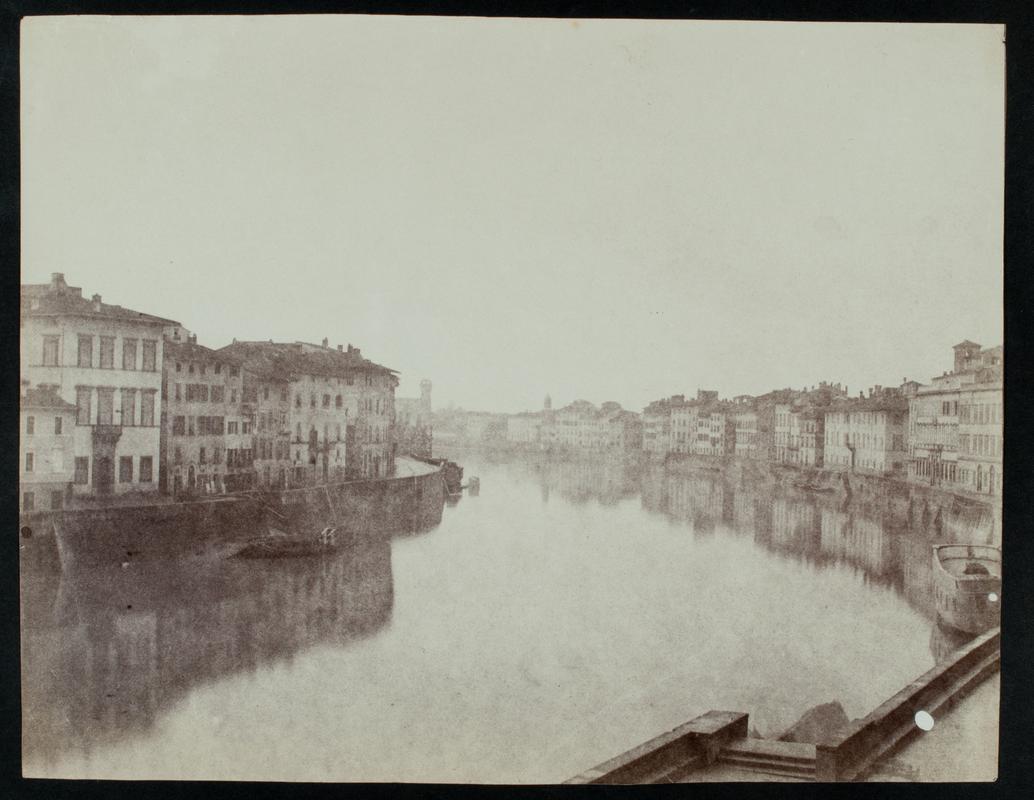 Salted paper print. View of a castle/chateau and town above a river, possibly in France or Germany. Top right corner clipped.
