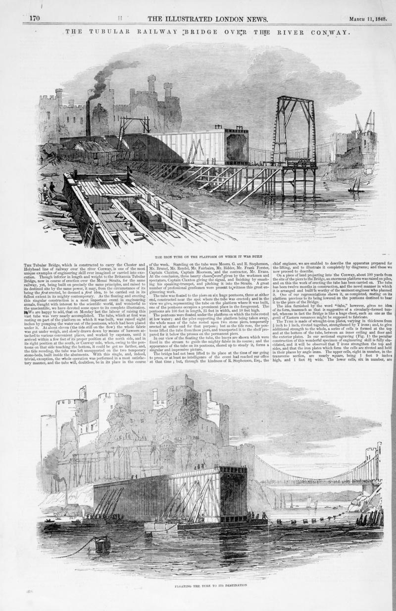 Page 170 showing engravings of 'The Iron Tube on the Platform on Which it was Built' and 'Floating the Tube to its Destination' with text in between. Reverse is page 169 and is all text.