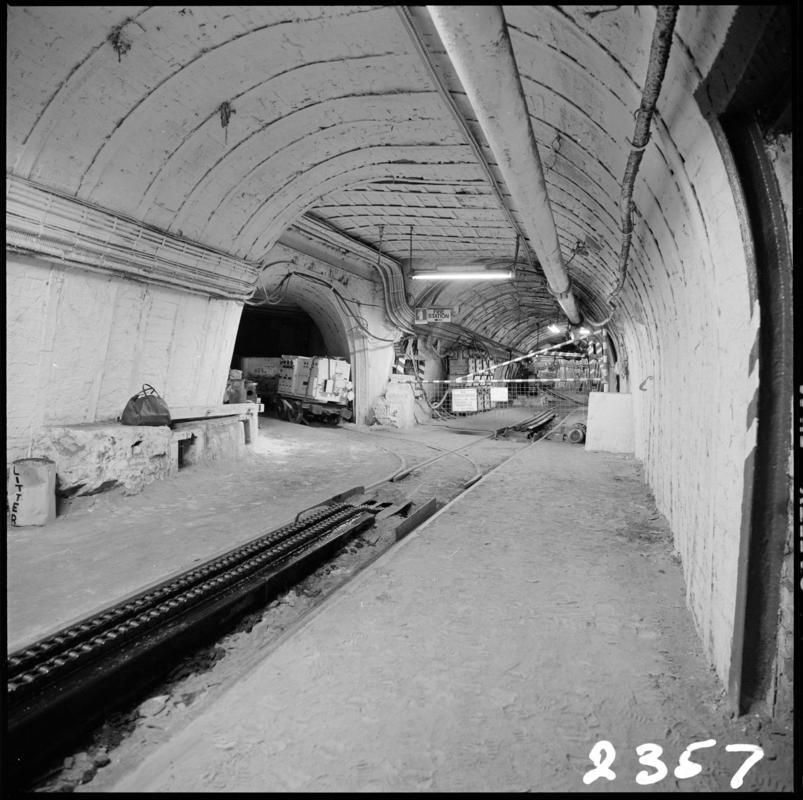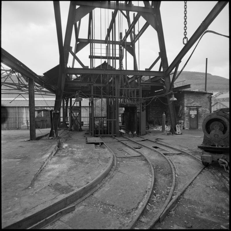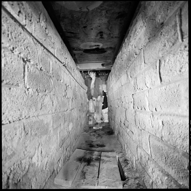 Black and white film negative showing the entrance of the drift mine, Aberpergwm 1978. 'Aberpergwm 1978' is transcribed from original negative bag.