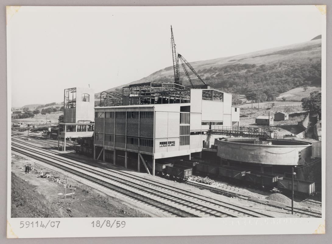 Black and white group photograph showing Big Pit fire fighting team with awards, 1958. Mounted on card with names men written below.