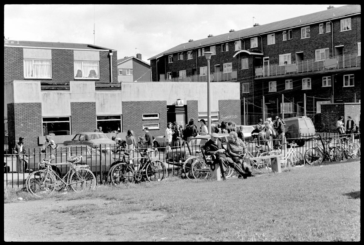 View of Spillers building from ground level being demolished, with a ship in the background, Butetown, Cardiff.