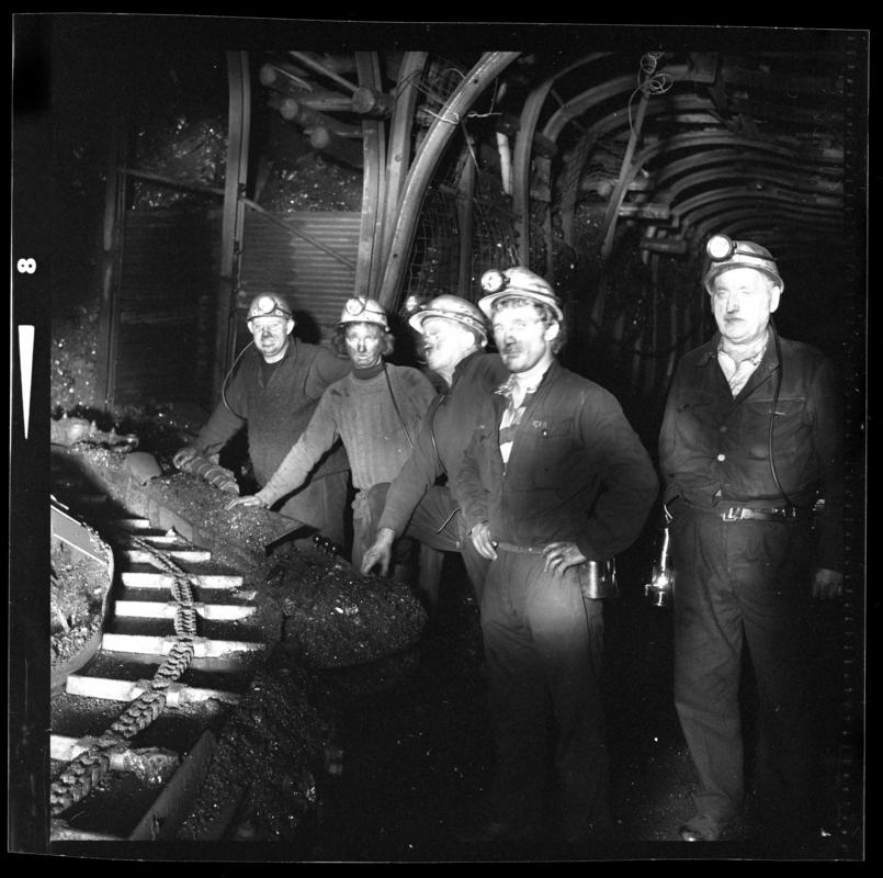 Black and white film negative showing a miner and undergound haulage machinery at Cwmtillery Colliery.