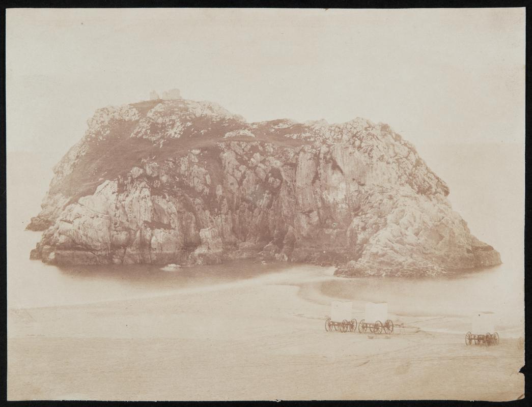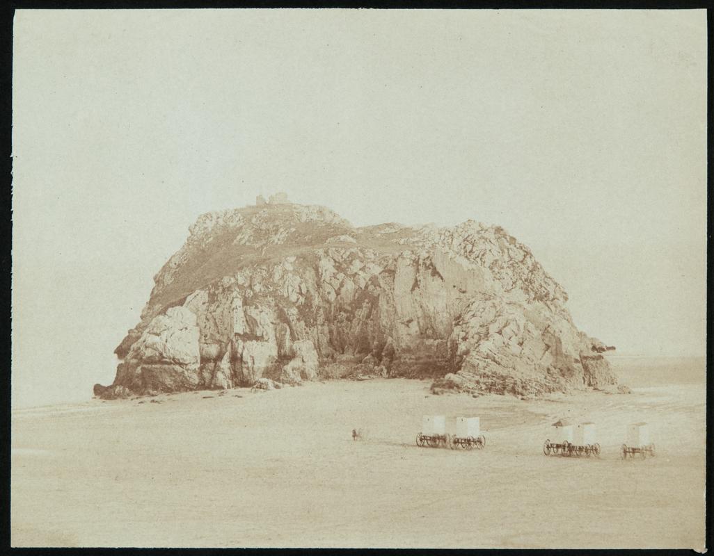 Mounted salted paper print (from collodion negative) showing St. Catherine's Island and and bathing machines on the sandy seashore.