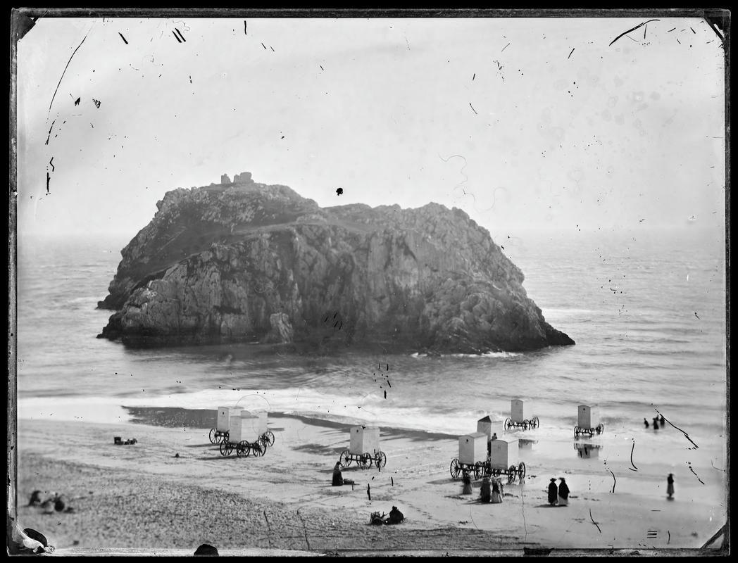 Mounted salted paper print (from collodion negative) showing St. Catherine's Island and and bathing machines on the sandy seashore.