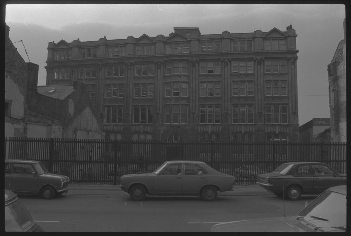 View from flats at Loudoun Square, looking south east. Railway can be seen in foreground, with docks in the background.